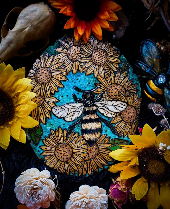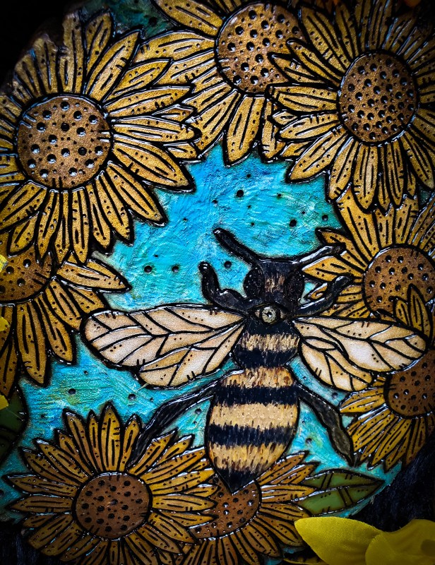 February 5, 2022August 22, 2022 Summer Bee Image has been hand sketched on, painted with water colors, mica powder, and herbal washes. The linework has been burned in using a pyrography tool. Share: Share on Pinterest (Opens in new window) Pinterest Share on Facebook (Opens in new window) Facebook Share on X (Opens in new window) X Share on Tumblr (Opens in new window) Tumblr Like Loading...
