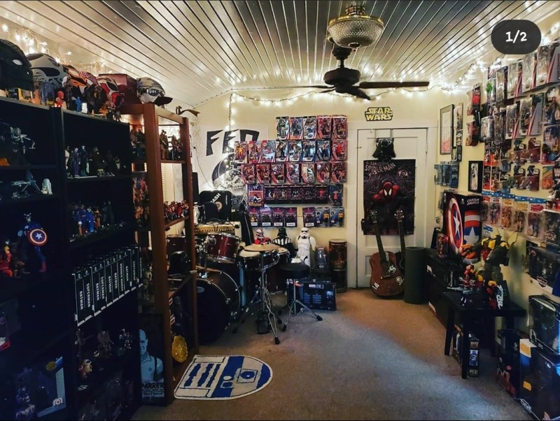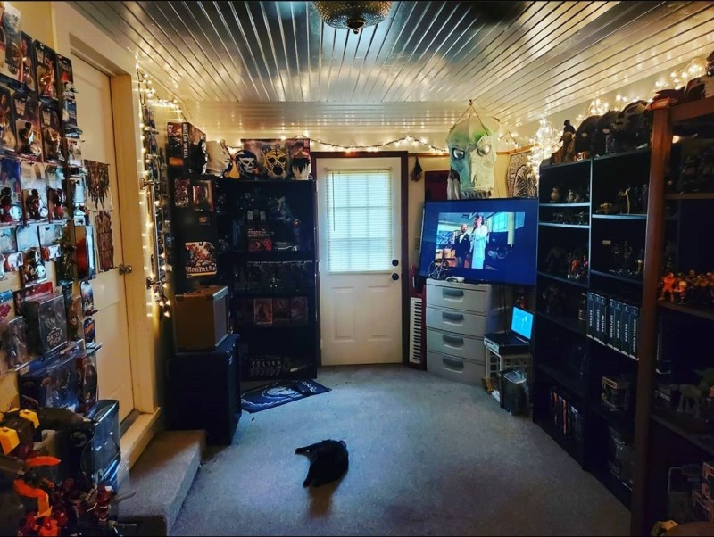 My husband really, really likes toys. He goes out at least once a week with his toy buddies and they will spend hours driving from town to town hitting up Walmart’s, Walgreens, Targets, and any other place that sells toys. He calls it “The Hunt”. He has a monthly budget to purchase whatever he wants (within that limit) but it’s not always about buying the actual toy so much as it is “finding it in the wild” as he says. The photos below shows his pride and joy, The Toy Room.